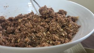1.Mai intai pisam / sfaramam cat mai marunt biscuitii cu jutorul unui robot de bucatarie. Presaram cacao deasupra lor.