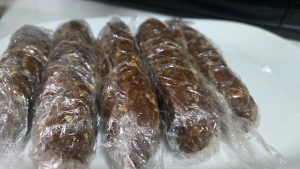 3.Rupem fasii de folie alimentara si punem cate 4-5 linguri de compozitie. Le dam forma de batoane subtiri si le infasuram bine in folia alimentara. Mie mi-au iesit 5 batoane de biscuiti. Dam batoanele de biscuiti formate la frigider timp de 30 de minute. Desfacem apoi batoanele de biscuiti din folia alimentara.