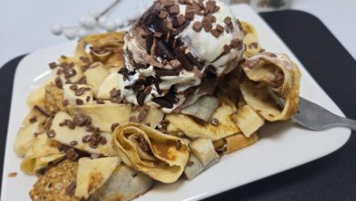 - Optional: pepitele de ciocolata sunt optionale, oricum adaugam sosul de ciocolata la final. La fel si frisca cu care ornam.