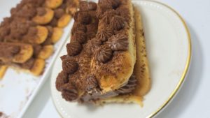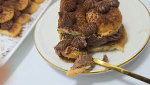 4.Adaugam jumatate din crema si apoi adaugam alt strat de piscoturi trecute prin laptele caldut.