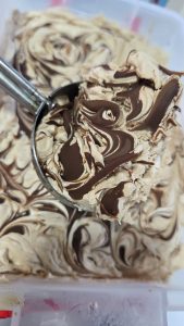 Pentru inghetata procedam astfel: Mixam spuma frisca lichida. Adaugam laptele condensat si ciocolata topita si mai mixam cateva secunde pana le integram bine. Punem compozitia in caserole si o dam la congelator.