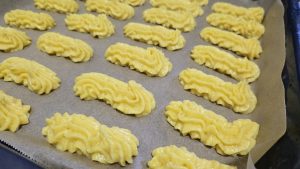 3. Coacem eclerele timp de 30-33 de minute sau pana cand se rumenesc usor in cuptorul prieincalzit la 180 de grade. Daca nu sunt coapte suficient de bine, eclerele se vor „lasa” dupa ce le scoatem din cuptor. Dupa ce se racesc le taiem capacele in totalitate.