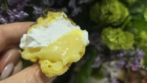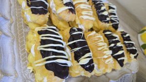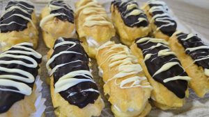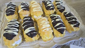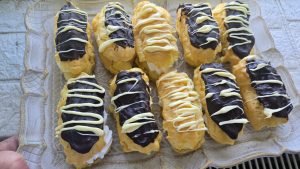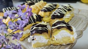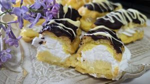 5.Umplem eclerele cu crema cu ajutorul unui pos si deasupra cremei adaugam un strat de frisca. Acoperim eclerele cu capacele taiate precedent.