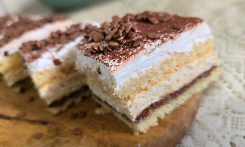 6. Adaugam stratul de crema peste stratul de Finetii, adaugam celalalt blat pe care il insiropam cu restul de lapte si finalizam cu un strat de frisca.